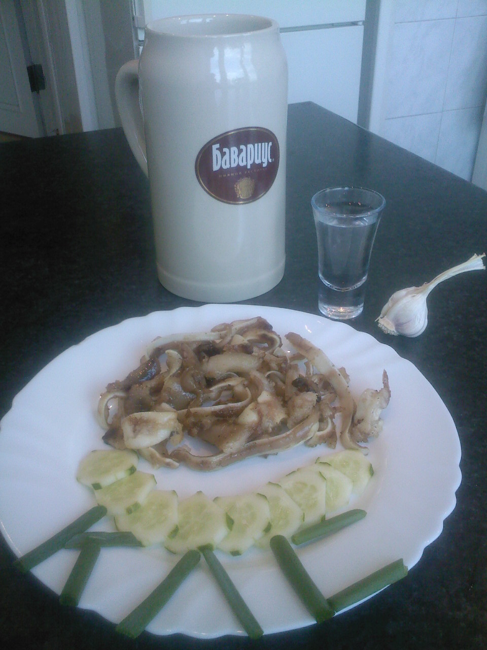 Суть любого уха – в хрящике. Вот оттуда-то я и пытался извлечь тот неповторимый хруст, который непременно должен ласкать слух при употреблении янтарного напитка (если кто заметит на фотке водовку – не ругайтесь, ну не могу я без неё). Уши варил один час с солью, лаврушкой и душистым перцем. После этого, в принципе, их уже можно употреблять с черным хлебушком, горчицей и водовкой (кстати, что я частично, не сдержавшись, и сделал,. Вот оттуда-то рюмка и появилась))).