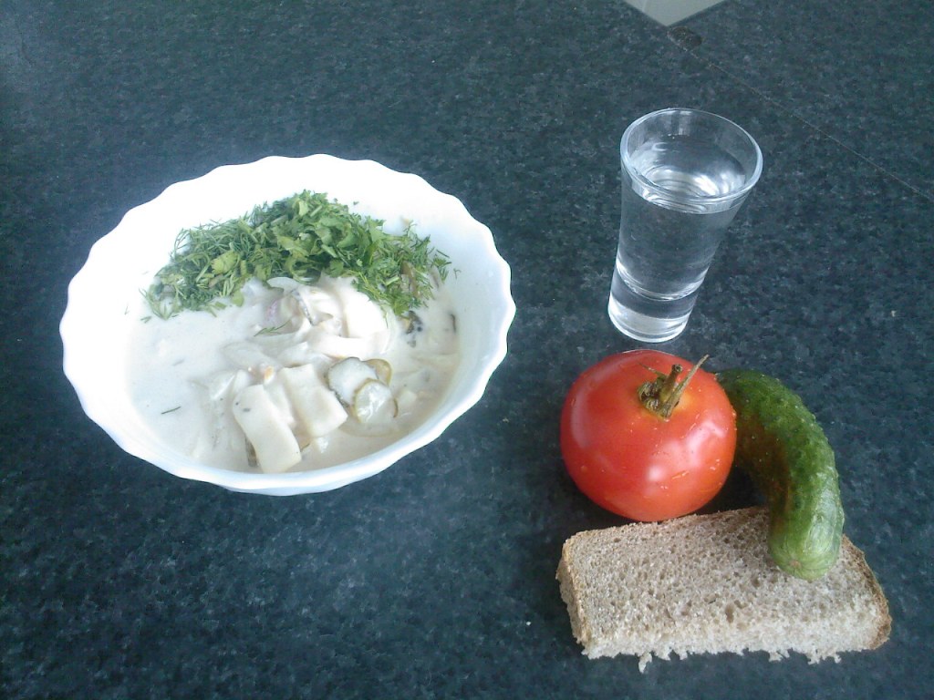 Все это закладывается в кастрюлю, вместе с отваренными и порезанными кольцами кальмарами, тушится минут 10 и… Наливай и пей.