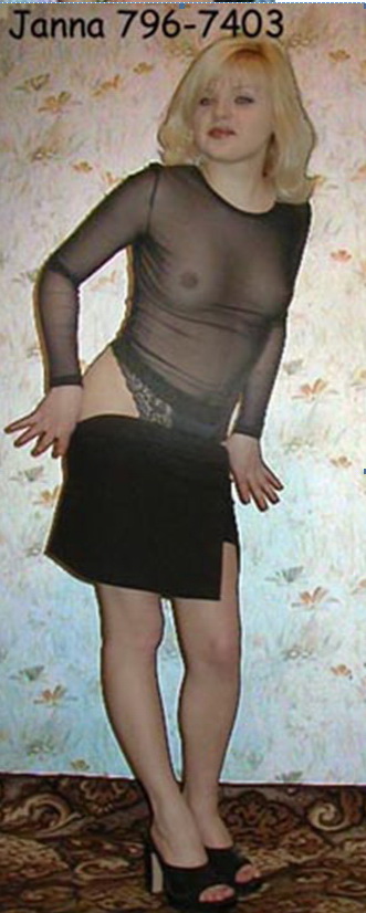 отрыл в личных архивах Заодно - анкетные данные: Имя Жанна Возраст 22 Рост 163 Вес 45 Бюст 1 Цвет глаз Зеленые Цвет волос Блондинка Телефон 7958445 HomePage http://girls.ruhost.ru/janna/ E-Mail janna_007@mail.ru Комментарий Приятная девушка позволит вам овладеть частями ее тела и души в зависимости от ваших способностей... Час -$35 (тридцать пять) Услуги Традиционный Оральный Анальный Массаж Лесбос-шоу Стрип-шоу Госпожа Рабыня Цены Цена часа традиционного секса 35 Ночь 100 Контактный телефон 7958445