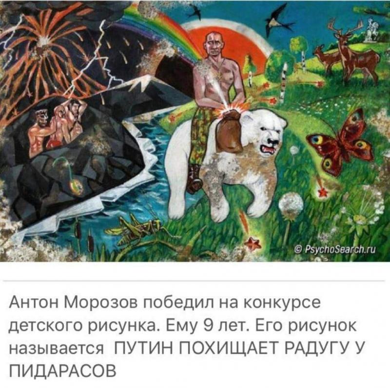 Надо же, российский ребёнок на конкурсе детских рисунков победил с картинкой, на которой изображены пидара$ы, а ЛГБТ-активисты при этом жалуются на ущемление прав сексуальных меньшинств в России...