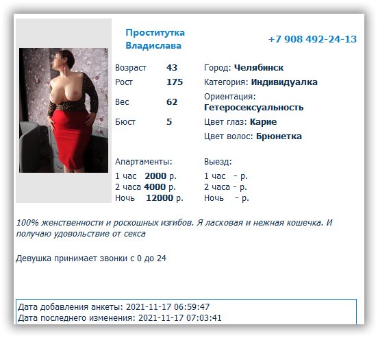 Пока ехал домой - думал тисну отзыв на путане, что б парни не попадались на этот колхозный колхоз… НО ))) тетя оперативно отключила в выдаче на сайте свою анкету. А фотка то у меня осталась ))) да и в отчет прикрепляю ссылку на другой сайт https://ch.cheleba.vip/girls/9517.html А там все та же маркетинговая “Владислава” правда телефон другой