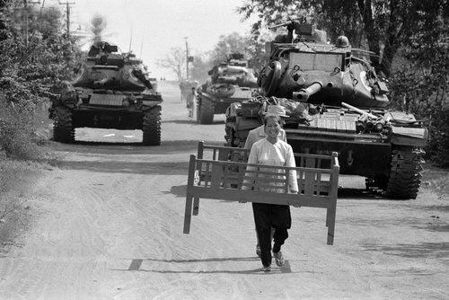 VIETNAM - UNDATED: Military tanks drive down the road while refugees escape the fighting near Lai Khe, Vietnam in 1973 during the Vietnam War.