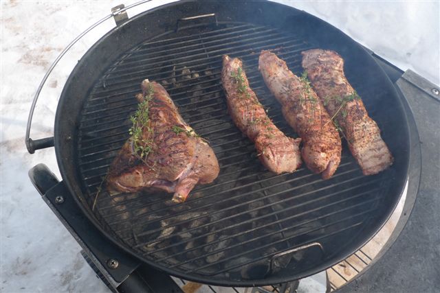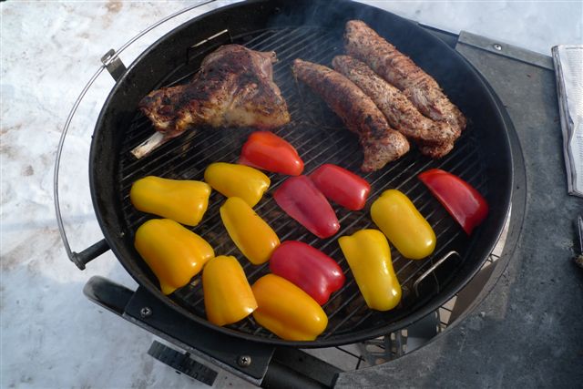 всем привет ! В предверии 8 марта выехали на дачу с целью отдыха, пьянства и поедания МЯСА. Итак было куплено на Ленинградском рынке: - ножка баранья - одна штук - за 450 рублей - вырезка телячья - три штуки - за 600 рублей - каре ягненка Австралия (упаковка) - 800 рублей (в Бахетле) Замариновано накануне с испольованием тимьяна, розмарина, морской слои, оливкового масла и других излишеств..... По просьбе женской части был приобетен свежий перец.... Итог получился - см фото...... Спецом для интересующихся:  - время приготовления - каре - 5-7 минут, - вырезка - 15 минут - ножка 35 минут - перец - 5-6 минут Лимонграсса - не клал  Вино - маркиз де Рискаль, Риоха Испания.