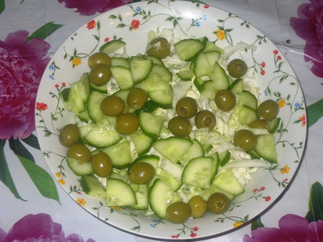 пока жарилась говядина, покрашил капусту пекинскую(половину кочана) заленый огурец и добавил оливки