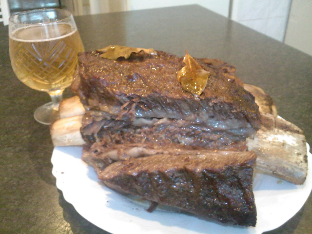 Приготовление блюда было приурочено к празднику, посвященному встрече с 800-й феей, поэтому для его приготовления была взята лучшая часть молодого бычка. Неее, не рибай, бери выше. В том , что в разрезе на ребрах мраморность выше, можно убедиться в прикрепленной фотке. В рукав такой кусок (а это стандартный размер) не залезет. Резать его — преступление, поэтому, как в школе учили - кусок целиком солим, перчим, добавляем пару листиков лаврушки (больше никаких специй), кладем в противень с высокими бортиками и накрываем все это дело фольгой, плотно обжав ее по краям. Мясо должно тушиться 40 минут на 220 градусов для корочки и последующие 60 минут — при 130 градусах для образования должной мягкости. Ну, а по сочности с этим разрезом тот же рибай рядом не стоял. Нежнее мяса не встретите. Приятного аппетита))