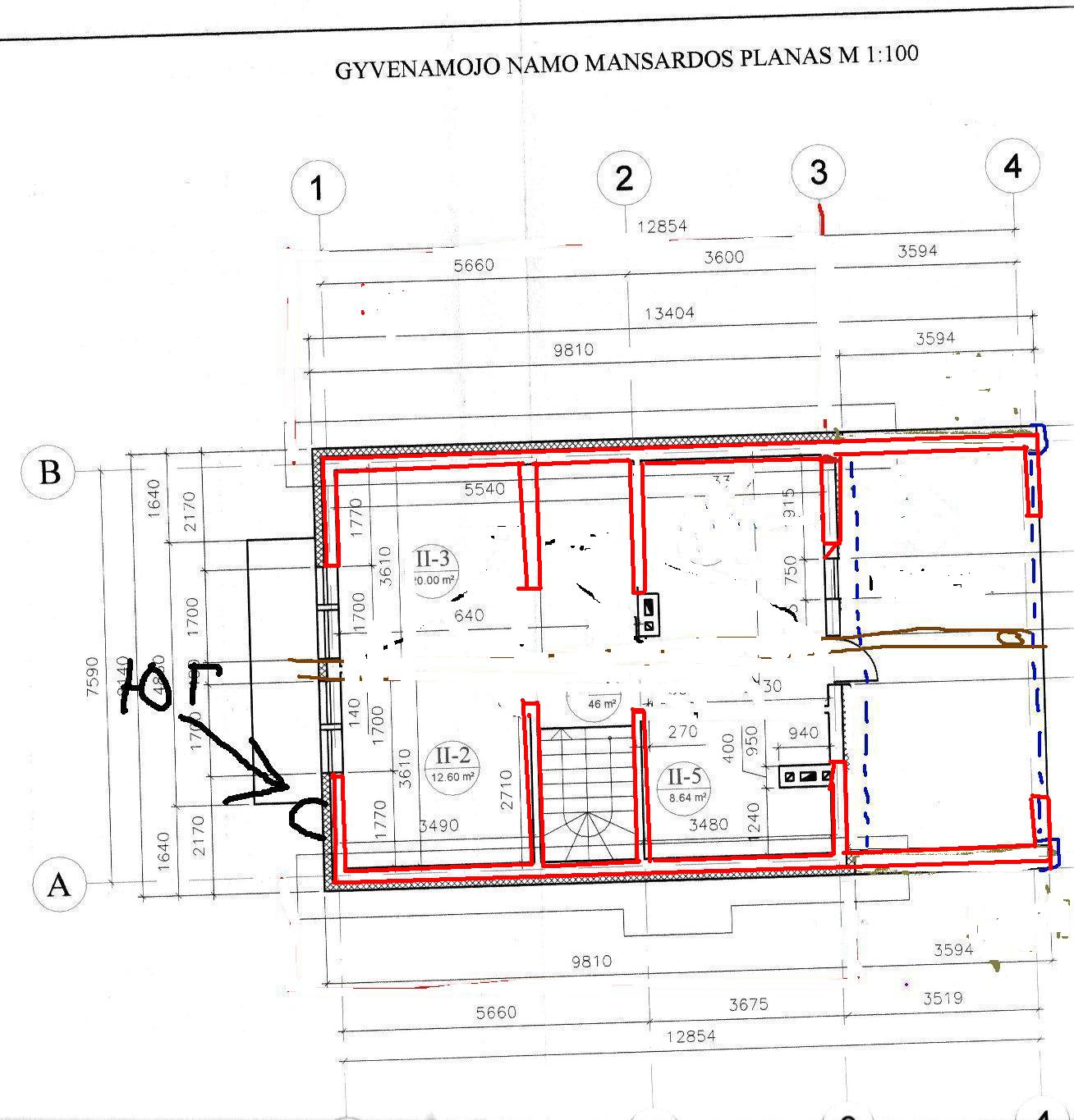 убедили делать крышу двухскатную. Пользуясь случаем хочу спросить- что переделать на крыше . Так как было проблема с отсутствием единого бетонного кольца( а были лишь бетонные полосы под муралетами на продольных стенах), то думаю разобрать часть кладки сводов и залить сверху новое кольцо схватывающие поперечные стены по 1,5 -1,7 метра(до окон мансарды - на фото планируемое новое бетонное кольцо красным цветом)и сделать на мансарде поперечнные перегородки примерно по 2,4 метра(на фото синим цветом), которые также схватить для крепости тем же самым новым железнобетонным кольцом. Приезжали две бригады. Одна бригада согласны с моим планом, другая грит, что не стоит ипатся с новым кольцом,чтооно ничего не даст, а лучше сделать подпорные столбики под каждым стропилом.