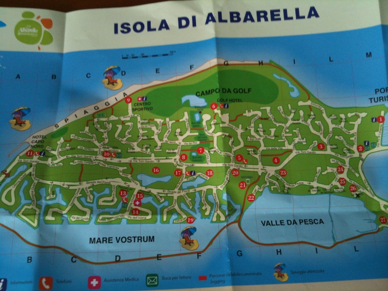 Концепция Остров соединенный длинным молом ( его недавно построили) на территории которого находится множество вилл, апартаментов, частных владений. Есть несколько ресторанов , два их них очень хороших, в одном из них я попробовал наверное лучший за свою жизнь тартар из говядины – размеры и качество его меня поразили невероятно. Есть огромный гольф клуб, большое конное хозяйство где дети с удовольствием берут конные уроки ( 25 евро в час) с опытными инструкторами и не облезлыми а вполне ухоженными лошадьми. Много кортов. Пляж большой песчаный мелкий и не песчаный глубокий . Недельная стоимость 3 лежаков + зонт = 120 евро на большом пляже. Море так себе. Основная ошибка- они навезли песка( который реально мелкий и красивый) – и насыпали его не только на пляж но и в море – поэтому при малейшей волне – цвет Адриатического моря ( вполне себе голубой скажем в Хорватии) – начинает походить на цвет Реки Янцзы или Азовского моря. Купаться можно, особого восторга не испытал. Есть несколько магазинов, прокатов велосипедов и гольфкаров.( 500 евро 2 недели) В виллах НЕТ ТЕЛЕФОНОВ. Единственное место , которое я нашел на острове где можно приобщиться к вай фаю – бар Ил Рустико. ВСЕ. Сигареты продаются только в двух точках и работают по очень специфическому графику. Ближайший прокат авто ( не арбарельный) в 30 км. В самой альбарелле – взять на прокат можно либо лакшари кар за мега овер лаве – либо ждать недели 3 когда освободится что то приемлемое. Машину не брал- брал гольф кар для поездок по острову.