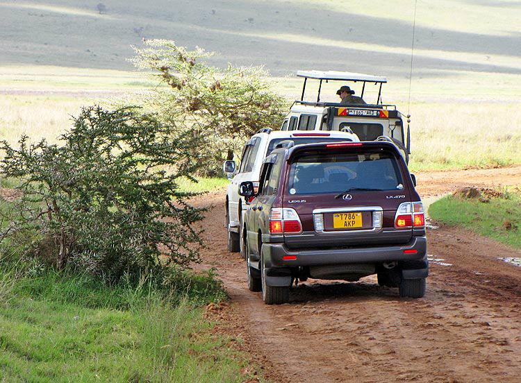 По дороге ненадолго заехали в город Аруша, где расположены штаб-квартиры большинства местных фирм, организующих сафари. Аруша – типичный африканской городок. Малоэтажный, пыльный, шумный и плотно стоящий в пробках практически на всех улицах. Пока наши водители собирали свои вещи в дорогу, сходили к банку, поменяли доллары на местные шиллинги. Курс оказался достаточно хороший – 1.575 шиллингов за 1 доллар при обмене купюр в $100 и $50 (на купюры меньшего номинала курс хуже). В дальнейшем курса лучше 1.500 не встречал. На выезде из города на останавливаемся на заправке – водители полностью заполняют солярой по оба бака на каждом джипе, а мы в магазинчике при заправке закупаемся минералкой, пивом и вином на ближайшие 4 дня. Объезжая пробки по пыльным переулкам, вырываемся из города и берем курс на первый национальный парк.