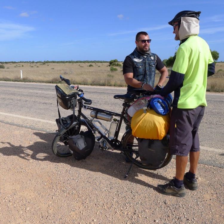 В первой половине дня мы выехали на самых прямую и самую длинную дорогу в Австралии протяженностью почти 150 км. Впервые в жизни я ни разу не повернул руль за несколько часов пути. Наверное, это был бы крайне скудный день на впечатления, если бы мы не встретили 53-летнего велосипедиста по имени Корелл. Мужчина в полном расцвете сил, уже три года как находился в кругосветном путешествии. Все путешествие он планирует завершить еще через три года, и того 6 лет пути. Мы отлично поболтали: Корелл родом из Австралии, всю жизнь проработал в красном кресте в различных горячих точках планеты. Свой кругосветный бюджет он распланировал из расчета 8 евро в день. Останавливается на ночлег он исключительно в палатке, всю еду готовит на примусе и считает все придорожные "roadhouse" грабителями. "Они пользуются тем, что людям негде взять воду, и продают ее по цене золота". Свой мобильный телефон и одновременно плеер он заряжает от маленьких солнечных батарей установленных у него на руле. Из вещей только две майки, одни штаны и инструменты http://www.worldtrip.total-flame.com/blog/92.html