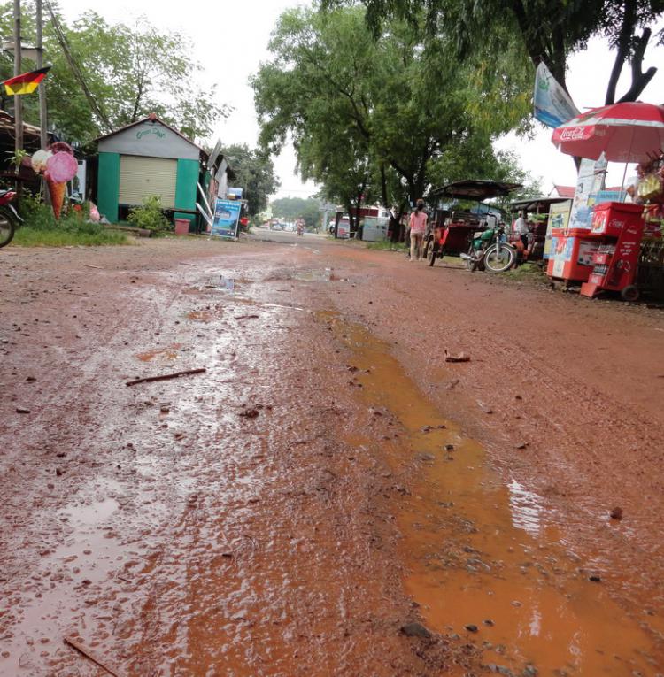 В Тае действительно дороги хорошие, говорят, в Малайзии еще лучше. А вот к востоку... Скажу так, что по-разному. В Камбо хорошая дорога от границы до Сием-Риепа, ну и по парку Ангкора. А в остальном... все, конечно, относительно, но я бы характеризовал те дороги, как "похуже русских". Реально, узкие, тесные, без обочин, окруженные подступающими вплотную лачугами или торговыми рядами базарчиков. Хиленькие мостики, потряхивает на ямах порой весьма чувствительно. Ну или вообще без асфальта. Ниже на фото далеко не окраина, а почти даже наоборот :