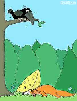 В: «Отдай плутовка сыр. А то я щас слечу, @бало на х@й сворочу. Я волку расскажу он вы@бет тебя». Л: «Да что мне волк, я со слоном @балась. С медведем делала аборт. С Барбосом еду на курорт»