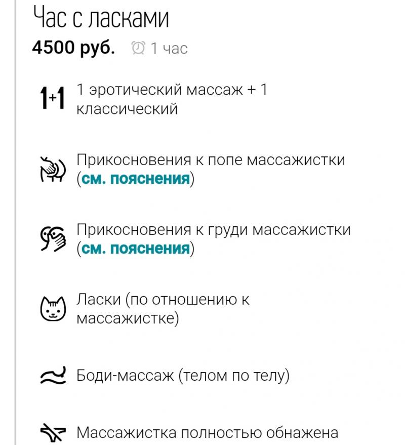 1. Описание программы “Час с ласками” за 3к салона “Пандора” на Дон Массажио совершенно не соответствует действительности. Зелёная рамка “Цены подтверждены” в данном случае оказалась фикцией. По версии админа и персонала салона, в этой проге есть лишь поверхностные прикосновения к груди, попе (без поцелуев тела) и ручная работа со стороны массажистки. Никаких полноценных прикосновений, ласок, имитаций и душ-коктейля.