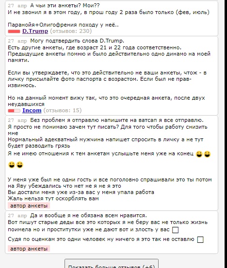 И что па вашей логике если феи платят бабки за анкеты значи они могут делать все что угодно!?! - ставить другой возраст , динамит клиентов - ИС это двухсторонняя площадка - не будет клиентов, феи не будут размещать анкеты, поэтому каждый такой случай надо рассматривать отдельно...Фредович не попал к фее о чем и написал, далее указал на несоответствие возраста - это тоже важно, чтобы дева не вводила народ в заблуждение, а то работает уже 3 года, а все 19 лет..