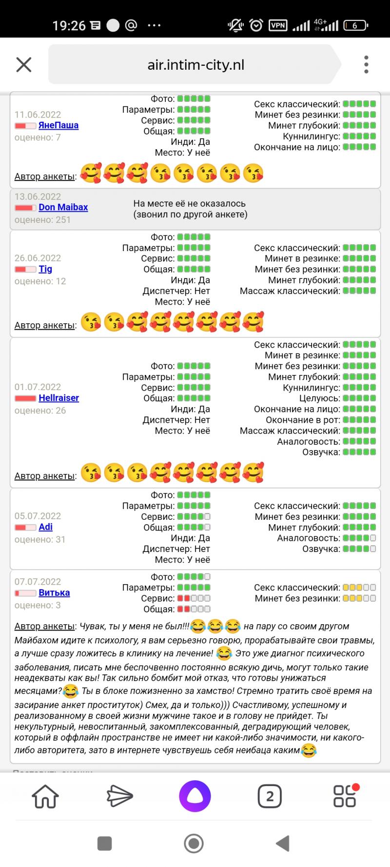 Написал на ватсап. Ответила - "звони". Набрал, диспа говорит подтверди за 30 мин, что в пути. Договорился на чёткое время и погнал на метро. Вобщем, за 30 мин написал в ватсап, - без ответа. Набрал по телу: не сняла его с.. ка. Короче злой попёр домой. В анкете написал гадостей. Плюс в Телеге, в закрытом канале, сообщили, что эта плять, эскортница давнишняя по странам Европы, ОАЭ и Италии.