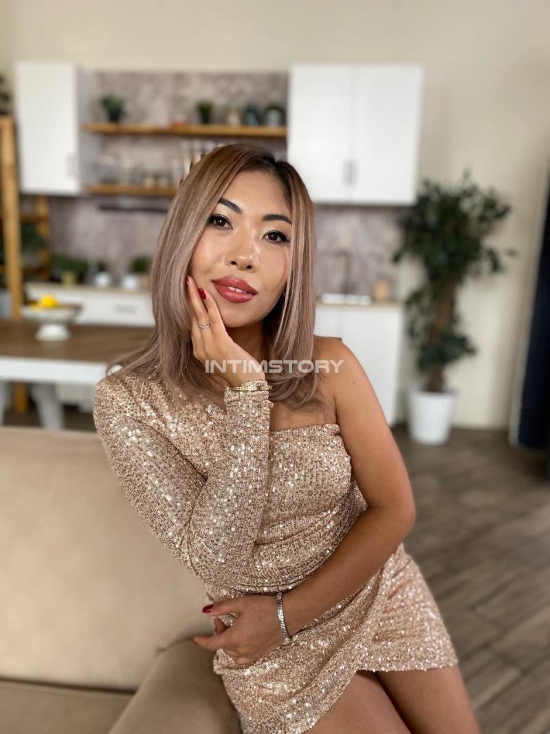 ТТХ. Всё как на фото. Лицо очень симпатичное, восточное, выглядит моложе заявленного возраста, максимум на 25, имхо. Глаза карие, с большими нарощенными ресницами. Губы большие и красивые, думал подкаченные, но сказала: "у меня всё натуральное".. Волосы прямые, светлые с мелированием (сказала, что недавно сделала), ниже плеч (свои чёрные). Рост 160, вес сейчас 47кг, сказала, что "за неделю работы в салоне похудела на 2кг". Взвешивалась. Грудь очень маленькая - 0,5 как у девочки подростка, с торчащими маленькими сосками (чувствительные к ласке). Фигура изящная и тонкая - модельная, пропорциональная и достаточно выраженная, на вскидку параметры: 60-88. Животик плоский как струна (не спрашивал, но думаю нерожавшая). Пирсинга, тутух, шрамов и растяжек - нет. Кожа гладкая и душистая. Попа круглая и упругая. Ноги стройные и красивые. В общем куй на неё (как говорится) встал с порога.. Мой формат. По-русски говорит как мАсквичка.