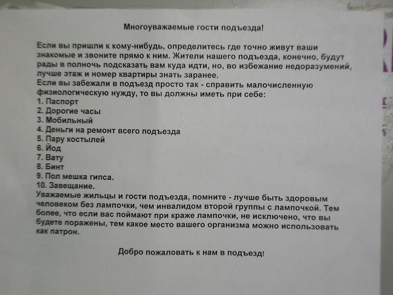 Уважаемые жильцы и гости подъезда, помните - лучше быть здоровым человеком без лампочки, чем инвалидом второй группы с лампочкой. Тем более, что если вас поймают при краже лампочки, не исключено, что вы будете поражены, тем какое место вашего организма можно использовать как патрон.