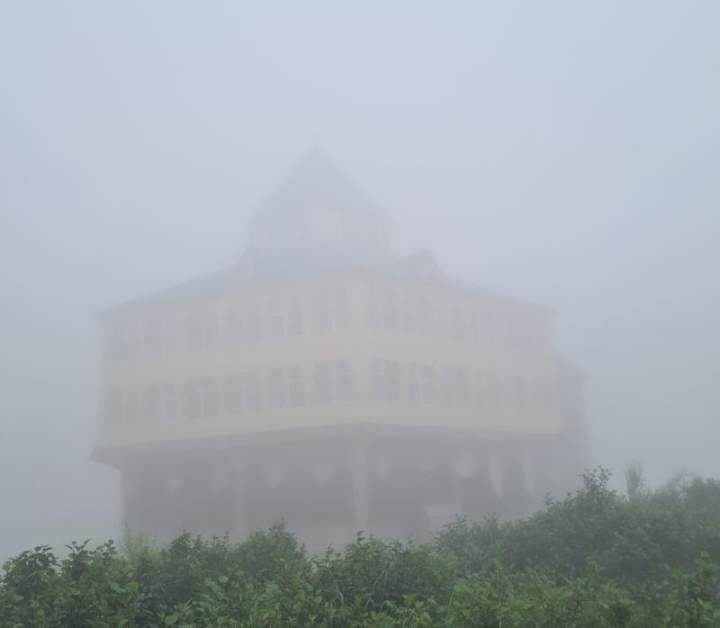 Второе фумарольное поле, «Группа Активная», находится где-то в километре от первого. Но добраться до него немного сложнее. Нужно пройти мимо эффектного здания гостиницы ГеоЭС, спуститься в овраг, перейти через ручей, а затем достаточно высоко подниматься в гору. Как назло, в это время опять пришел туман. И когда мы добрались до фумарол, было уже непонятно – то ли это бьет пар из-под земли, то ли просто все в белом облаке. Считается, что фумаролы «Группы Активная» более зрелищные и эффектные. Мне так не показалось. Может, из-за тумана, может потому, что местность на этом поле голая и безжизненная. И воняет сероводородом еще сильнее, так, что начала болеть голова.  Если на первой площадке была куча народа, то до второй помимо нас дошло лишь несколько человек. И обратно мы шли уже в одиночестве. А туман продолжал сгущаться. Гостиница ГеоЭС походила на какой-то Ходячий Замок Миядзаки.