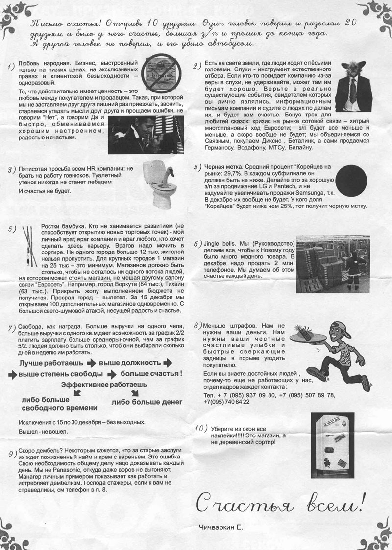 Хотя для того, чтобы поддерживать такого рода энтузиазм своих работников - ему хотя бы раз в месяц надо такие агитки кидать.... .... я бы на его месте подумал бы про агитки не для своих продавцов(они и так поняли, куда попали ), а для покупателей! (их - намного больше! И отдача будет ЖОЩЩЕ!!!) Если этот чел читает этот мой постец: