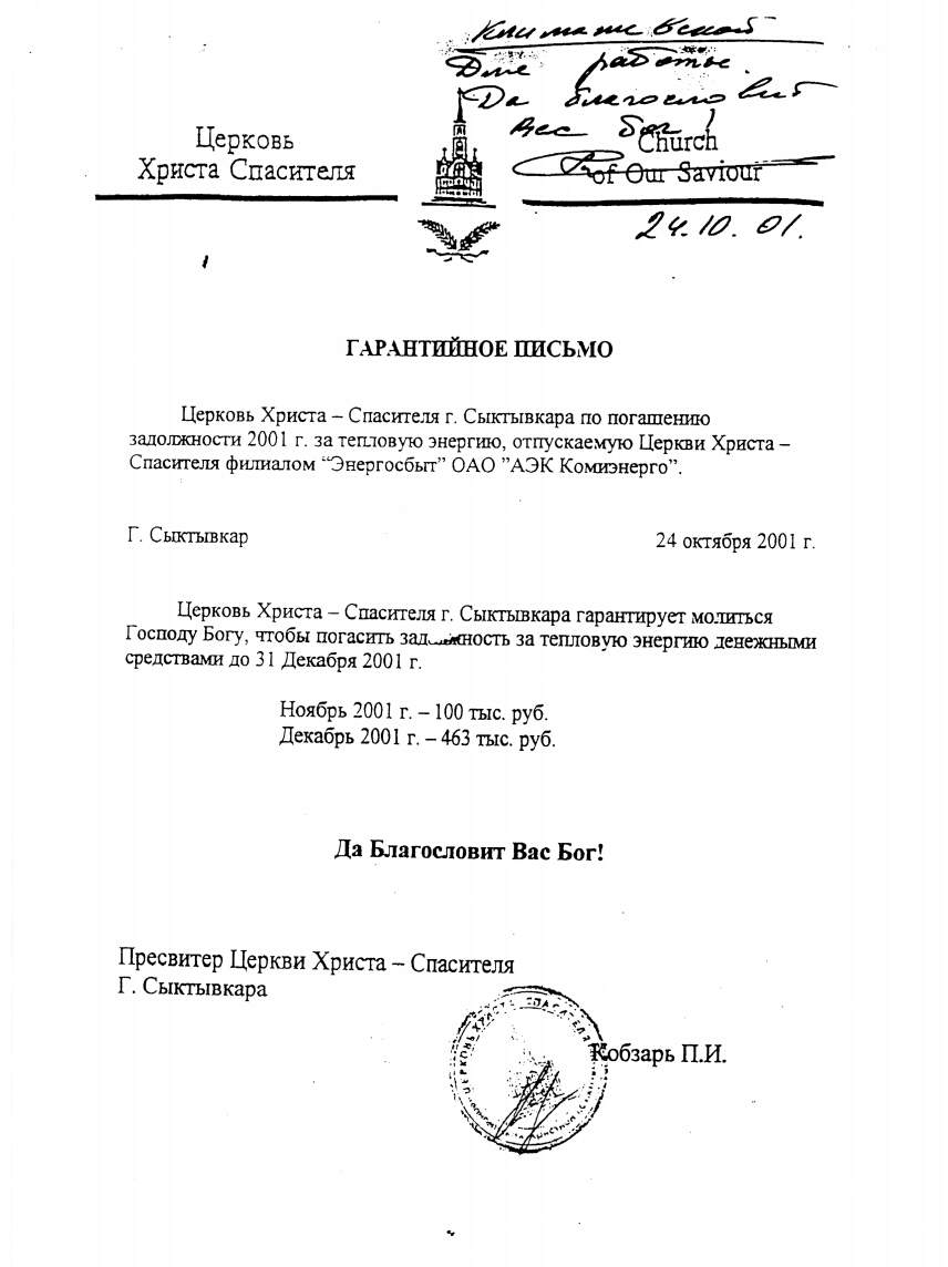Церковь. Гарантийное письмо.