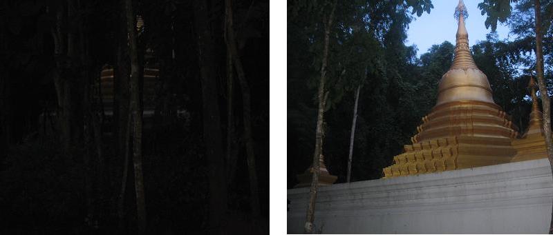 Выходим на поляну. А это не поляна оказывается, а футбольное поле на котором пасется корова. Идем за монахом дольше. Снова темно. Снова полянка, но поменьше. Батюшки, дык это ж баскетбольное поле. Монах продолжает путь, мы за ним. Снова темно. Монах куда-то исчез. А вокруг все так же темно и уже немного страшно, вдруг какая змеюка выползет, в том что они тут водятся никто не сомневается, все таки джунгли. уже собираемся разворачиваться обратно, как замечаем где-то вдалеке что-то золотое. Стало любопытно. Просто поразительно. За несколько метров до храма наблюдаешь золотые блики в кромешной темноте, а проходишь эти самые несколько метров и вот тебе белый деь и золотая крыша храма и несколько монахов в своих рыжих одеяниях. Уходим, негоже людей беспокоить.