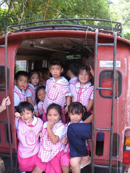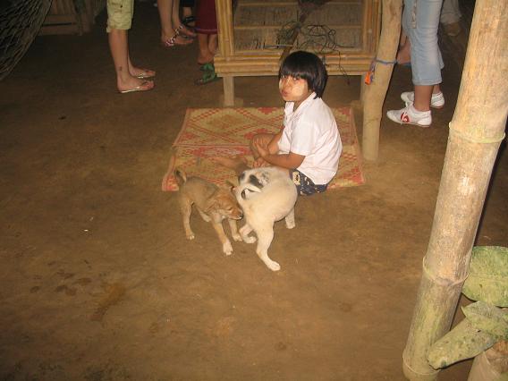 Деревушка Мон. Ничего особенного на первый взгляд. За исключением того, что изза густой растительности днем там очень темно. Много дружелюбно настроенных собак со щенками. Тайские детки играют с сучьими малышами на полу.