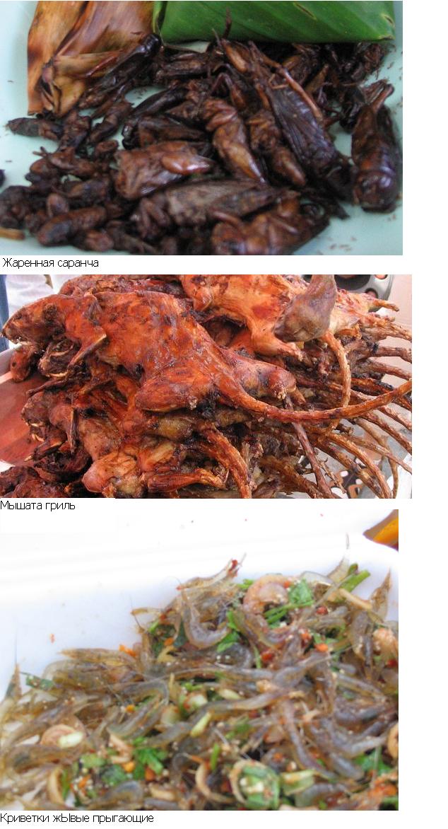 После лягушки все было проще. Поэтому жаренных червяков, тараканов и саранчу ела спокойно. Сложнее было с мышами и крысками У меня дома долгое время домашние крыски жили. И вот когда я прикупила жаренного мышонка (1 кг стоит 80 бат) было такое ощущение, что собираюсь слопать свою Кристинку Оторвала хвост и голову, стало легче Отщипнула от задней лапы кусочек, съела...ничего особенного, мясо как мясо, только мало. Труднее всего было заставить себя съесть креветок живых. Маленькие такие (около двух сантиметров), в тазике плавают. Их при тебе вылавливают ситечком, посыпают зеленью и специями и желают приятного аппетита. А они в ложке прыгают Но вкусные, правда-правда вкусные