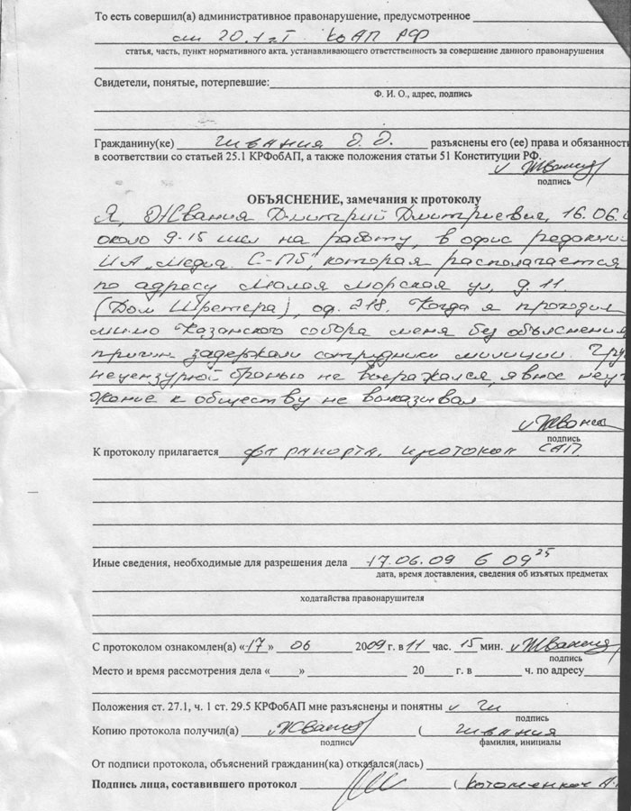 Как видите по форме протокола с вас требуют 4 подписи: - Роспись в том, что вам разъяснены права и обязанности, Речь идёт о ст.25.1 КоАП и ст. 51 Конституции. (их никогда не разъясняют, ибо сами полицейские их не знают). - Подпись под объяснением ваших действий совместно с наличием/отсутствием у вас заявлений. - Роспись об ознакомлении с протоколом. - Роспись в получении копии протокола. 4.1. Если права вам не разъяснили так и запиши́те «права не разъяснены» и подпиши́тесь. 4.2. Если адвоката рядом с вами нет - вам самим нужно решить, что писать в объяснениях. Вы можете стандартными фразами объяснительных или записать своё: - От дачи показаний отказываюсь на основании ст. 51 Конституции до консультации с адвокатом. - Я участвовал в мирной акции, незаконных действий не совершал, подробные показания дам после консультаций с адвокатом. (желательно конкретную формулировку продумать заранее с организаторами и/или координаторами например «Я участвовал в мирном шествии, разрешенном Правительством Москвы...») 4.2.1. Если можете, укажите свидетелей вашего задержания, которые не были задержаны — впишите их ФИО. 4.2.2. Если есть опасения, что на вашего свидетеля будет оказано давление до суда, то напишите примерно так «Свидетелем моего задержания, который подтвердит, что я не совершал противоправных действий является парень по имени Сергей, фамилию не помню, начинается на букву П, проживает в районе таком-то, точный адрес знаю визуально, явку в суд обеспечу сам» 4.3. Если у вас есть замечания (например, при задержании у полицейского не было значка или если у вас ещё нет защитника напишите «Мне нужен адвокат» или не дали сделать один звонок родственникам, запишите и это – всё что сможете «накопать») и прочие важные моменты то впишите их, так как протокол — единственный документ с вашими словами, который точно попадёт в материалы дела. Если вам не хватает места - можете написать их на отдельной странице и в протоколе указать, что объяснения прилагаются на дополнительном листе. 4.4. Так же в протоколе рекомендуется написать «Прошу рассмотреть дело по месту моего жительства на основании ч.1 ст 29.5 КоАП РФ». Если данное ходатайство будет удовлетворено то шансы решить дело в вашу пользу увеличатся, так как суд по месту жительства мало связан с задержавшим вас отделом полиции. После того, как вы (или с ваших слов) всё в протоколе записали, вас попросят расписаться, что с протоколом вы ознакомлены. 4.5. Прочитайте протокол и обязательно распиши́тесь, что с ним ознакомлены. Отказ от подписи/визирования вообще ни где не допускается, а при отказе подписания протокола просто вызовут двух свидетелей и они подпишутся, но большой вопрос под чем они подпишутся? Может они напишут, что вы полностью признали свою вину? В ваших интересах лично прочитать и расписаться. Интересный момент. Если в протоколе ваши ФИО указаны не верно - так даже лучше, легче будет развалить дело в суде. Т.е. это несоответствие можно «не заметить» при подписании об ознакомлении протокола. 4.5.1. Важно. Потребуйте копию протокола перед тем, как поставить подпись о её получении. В этот момент почти во всех ОВД ломается ксерокс и вас просят просто подписать протокол. Предложите сотруднику полиции, что вы подпишите «копию не получил» и распишитесь, ибо врать вы не умеете. Иногда это помогает починить ксерокс. Если нет —