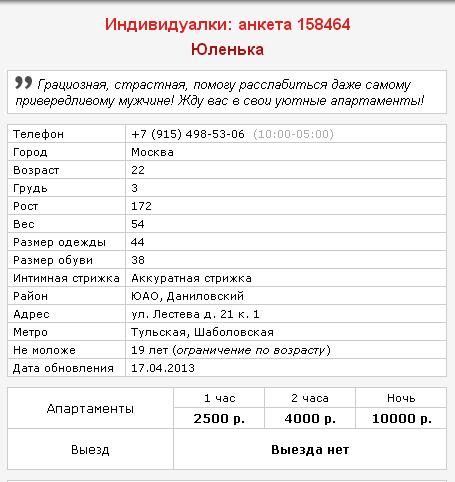 Цена: 2500 руб за 1 час, 4000 руб за 2 часа, 10000 руб за ночь.