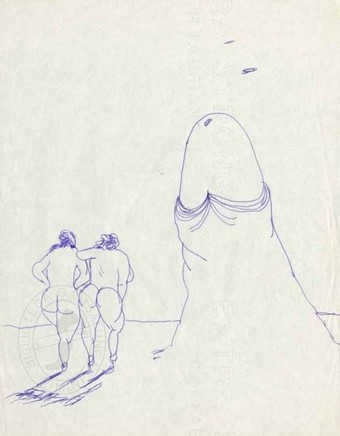 "Мои рисунки - это почти бессознательное, непроизвольное выписывание на бумаге всевозможных загогулин - автоматическое вырисовывание гиперсексуальных женских фигур, дряблых лиц кардиналов, горящих свечек, опять-таки грудей и задов, и бесконечного множества не поддающихся расшифровке закорючек среди россыпи телефонных номеров, адресов, бредовых стишков, подсчетов суммы налога вперемешку с расписанием свиданий; в общем, вся эта пачкотня (сущая находка для психиатра), может быть, как раз и есть тот самый след, та самая ниточка, на КОНЦЕ*** которой - павильон, включенные юпитеры и первый день съемок."