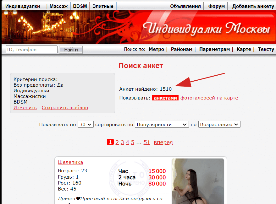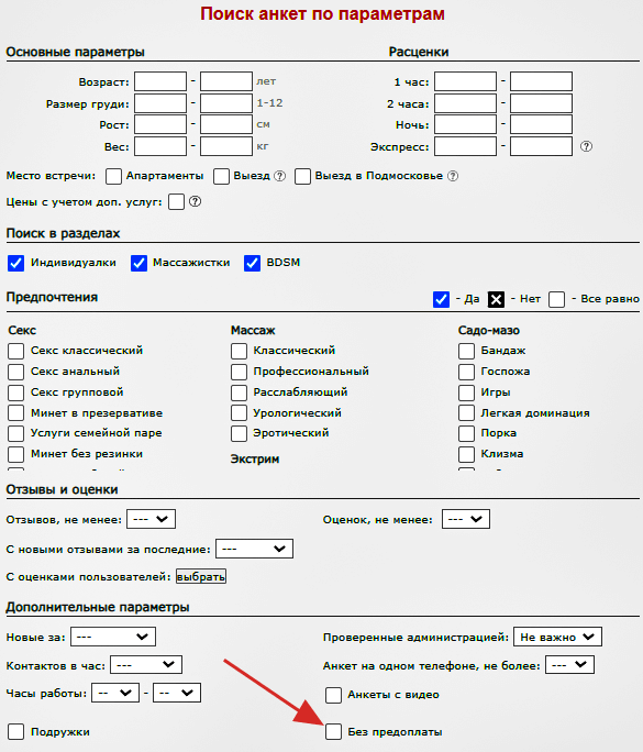 "Индивидуалки" -> "поиск по параметрам"См. первый скрин, отмечаете "без предоплаты", получаете второй скрин (в след. посте). На нем видите 1510 анкет. А без этой галки (т.е. без предоплаты) 7510 анкет.Еще интереснее выезд/апартаменты Апартаменты все: 6394; без предоплаты: 1440; 22% Выезд все: 4539; без предоплаты: 734; 16% Откуда вывод, что салоны реже требуют предоплату. А всего несколько дней назад, когда эта опция была введена (по просьбе фей, кстати), без предоплаты было всего 8%. Видимо, одумались. Феи сами устроили себе гемор, потому что неопытные, случайные клиенты теперь будут жать в поиске, "без предоплаты" и просто не увидят возможно хорошие анкеты.Они думают, что если все феи будут ставить предоплату, то клиенты привыкнут и будут ее переводить. Даже если такое случится, надо помнить "эффект безбилетника": если клиент приучен к предоплате, он начинает посылать ее всем, а значит, вырастет процент мошенниц. Можно ведь получить предоплату и слиться, а анкету поменять, это несложно. Это же не магазин, сайт не гарантирует оказание услуги, все на доверии. И вместо всеобщего "приучения" феи получат всеобщее недоверие.