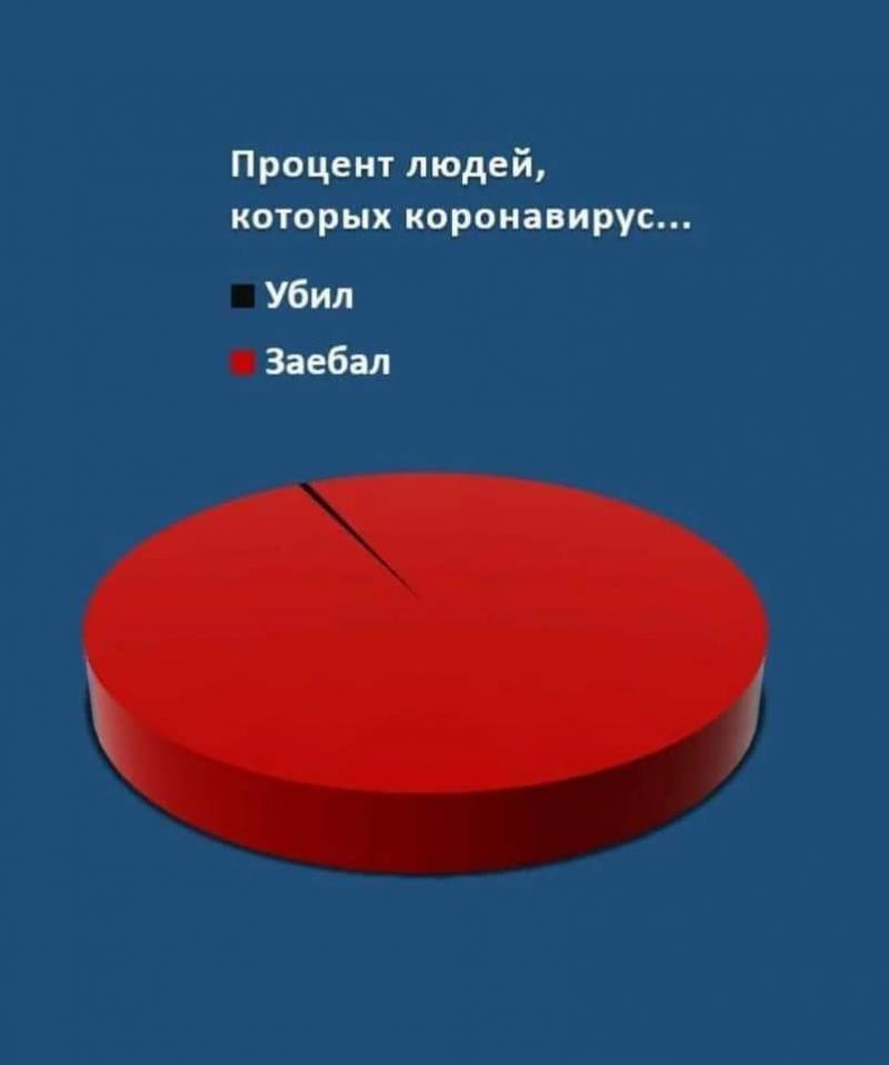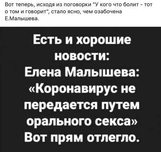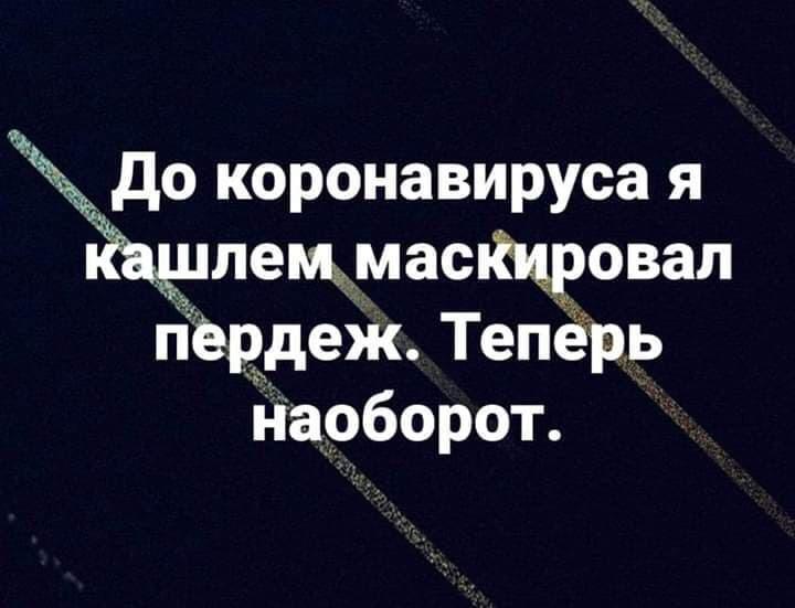 В метро: - Мужчина! Вы все время кашляете, у вас коронавирус! - Да нет, это всего лишь открытая форма туберкулеза. - Фух! Слава Богу!