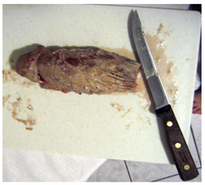 5. Кухонный Этот способ самый банальный, но очень практичный. Выбираете тяжелый нож для рубки мяса, проверяете насколько он острый. После этого кладете член на край стола и сильным ударом отрубаете. Очень важно отрубить с первого раза, так как на второй у вас может не хватить терпения. В конце концов, вы же не мазохист какой-нибудь!