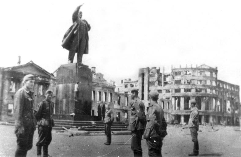 В 1942 году мощным ударом немцы взяли правобережный Воронеж (захватить левобережье не удалось). Захват был стремительный, по сему многих людей эвакуировать не удалось. Как же повела себя "культурная нация" в захваченном городе? Рассказываю (в каких-то цифрах могу ошибвться, но общий порядок верен). Итак, войдя в город, истиные арийцы сразу расстреляли 300 человек мирных жителей в качестве мести за потери, понесённые при штурме. Не коммунистов, а простых людей, в основном женщин и детей. Для коммунистов и членов семей воинов красной армии в качестве виселицы был преспособлен памятник Ленину на центральной площади (см. фото). Количество повешенных не известно. Далее, были уничтожены все пациенты и врачи местной психиатрической больницы, около 10000 человек. Врачи и пациенты областной клинической больницы были сожжены огнемётом в подвале (что-то около 600 человек). Далее, немцы приступили к выселению и уничтожению города. Местных жителей из выгоняли из города в степи (многие из них погибли от голода и холода), а дома взрывали или сжигали. Отказывавшихся уходить расстреливали на месте. Судьба нескольких тысяч оставшихся в городе жителей ещё плачевнее: их согнали на возведение укреплённой линии обороны, а по выполнении работ ликвидровали ВСЕХ.