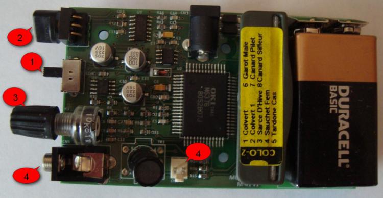 Органами управления устройства являются: 1 - выключатель (два положения - ВКЛ и ВЫКЛ) 2 - селектрор выбора звуков (10 позиций - от 0 до 9) 3 - регулятор громкости Имеется также 4 - разъемы для подключения динамиков
