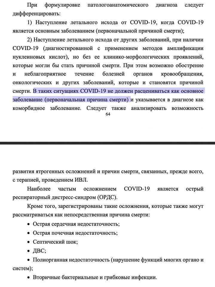 Вроде уже обсуждалось. Российскими инструкциями, в которых Минздрав явно рекомендует записывать в качестве причины смерти другие причины, т.е. если пожилой человек подхватил коронавирус и умер, потому что сердце не выдержало, то Covid-19 не пишут.