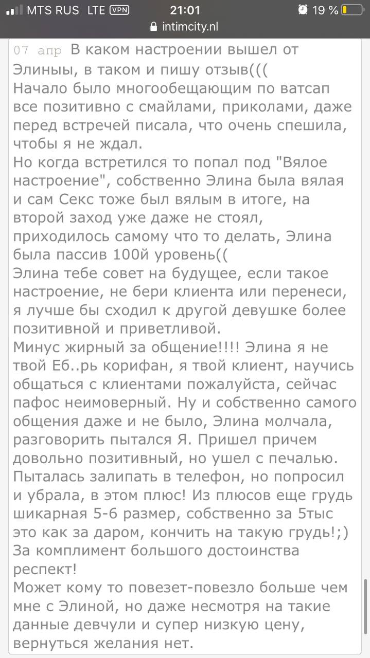Стал пользователем сайта лишь для опровержения написанного ранее. К Эле хожу больше полугода и по традиции прибыл к ней в минувшее воскресение. Анкета была удалена, но номер доступен, поэтому вопросы были неизбежны. Выяснив детали выступаю в роли защитника. К слову, в сторону обидчика не было ни одного плохого слова, цитирую -« плохо не хочу говорить, мы все люди разные, не сошлись просто, так бывает»., Хотя видно что девчуля огорчена ситуацией. И так, по поводу процесса, фото, внешности, сервиса и всего прочего: Не смотря на мои частые посещения ВСЕГДА встречает с красивыми волосами и макияжем, обалденный парфюм, тапки, чистые полотенца, простыни, гели на любой вкус и цвет, хлор, чистота в квартире, хорошая музыка, все на высоте. (в последний раз встретила в шикарном платье). Фото соответсвует, в жизни и правда лучше, милее, приятный голос. Грудь чуть больше 5го размера, про висит до живота- огромное преувеличение. Да, она не стоит колом до подбородка, но на то она и натуральная, при таком размере будет «подвисать» при том что кожа у девы нежная. В процессе всегда ориентируется на предпочтения. Спрашивает что и как хочу, быстро/медленно/сильне/глубже/сидя/стоя и тд. Минет-отдельная тема, выше всяких похвал. Не заезженная, хотя достаточно уже в сфере, видимо хорошо отдыхает тк часто пропадает с сайта на месяц-другой. В плане общения: остаюсь на 2-3 часа тк больше времени проводим за беседой. Если обратите внимание на отзыва к удалённой анкете, то поймёте о чем я говорю. Эля одарена красотой и интеллектом, этого у неё не отнять. + ЧЮ вышка. По поводу пафоса, я не могу понять где его отыскали. Бывает не разговорчива иногда, но мы и не беседы приходим вести, по большей части. Так же хочу отметить, что автор отзыва разнится в своих оценках и аргументах. В отзыве на ИС пишет цитирую - «Из плюсов ещё грудь шикарная 5-6 размера, собственно 5тыс это как за даром, кончить на такую грудь» и так же пишет что цена очень низкая для такой девчули. Делаем выводы, джентельмены! Я в свою очередь рекомендую к посещению. Всем добра и приятных походов!)