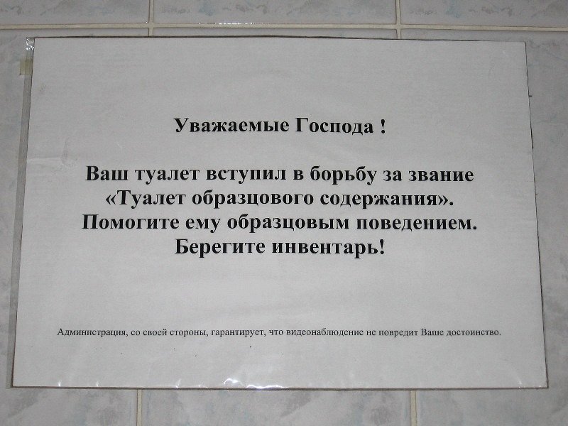 Ниоткуда не стырено. На прошлой неделе, закончили ремонт в туалете на этаже нашего здания и, повесили в нем такую объяву. Самое прикольное - подпись мелким шрифтом внизу. Зырим аттач!