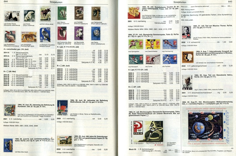 Бесплатный онлайн каталог можно посмотреть, например, здесь. Правда, по нему представление о ценах составить трудно. Можно подписаться онлайн на немецкий каталог Michel - обойдется в 6 евро в месяц. Для примера прикрепляю копию страницы из этого каталога с зеленым токийским блоком - одним из самых ценных советских блоков послевоенного периода. Там же можно увидеть (в евро) и цену других, обычных советских марок. Нужно только иметь в виду, что рыночная стоимость марок обычно гораздо ниже (в 3-4 раза минимум), чем указанная в каталоге Michel.