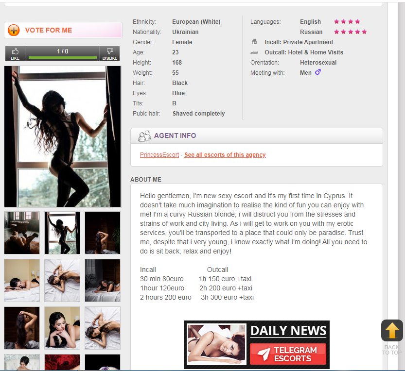 Интересует эта барышня уверен работала в Москве много анкет было ,сейчас правда на Кипре трудиться в эскорте,возможно кто -то встречался или есть инфа по ней ,буду благодарен.