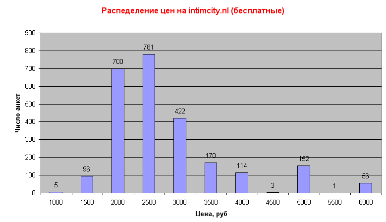 Итак, тут я решил вывести средние цены по dosug.cz и пришел к выводу, что "бюджетным" платным сексом можно считать все, что ниже 3500 за час. Однако, выборка на dosug невелика (всего 433 анкеты), цена рекламы там высока (400 евро/мес). Хотелось проанализировать такое же распределение на intimcity.nl. Итак, на интимсити есть раздел платных и бесплатных анкет. Платные стоят не выше 157 руб/день и стоят на первых страницах. В момент исследования (день 25 февраля), на сайте было 64 стр. Рервые 11 стр. - платные анкеты, 13-64 - бесплатные, и 12-я стр. примерно поровну распределена между теми и другими. Предположим, что платность анкеты как-то влияет на цену часа и разделим их. Итак, платные анкеты. Всего найдено 582 анкеты. Сначала убрал двойники (когда на анкете совпадает и телефон, и фея. Потом убрал анкеты, где нет цен (больше 100). Варианты одной и той же феи с разными телефонами не анализировались). Осталось 431 анкеты, из него и строилось распределение (см. график). Можно сказать, что средняя цена тут лежит в районе 3000 руб. Исходный exel Продолжение - бесплатные анкеты.