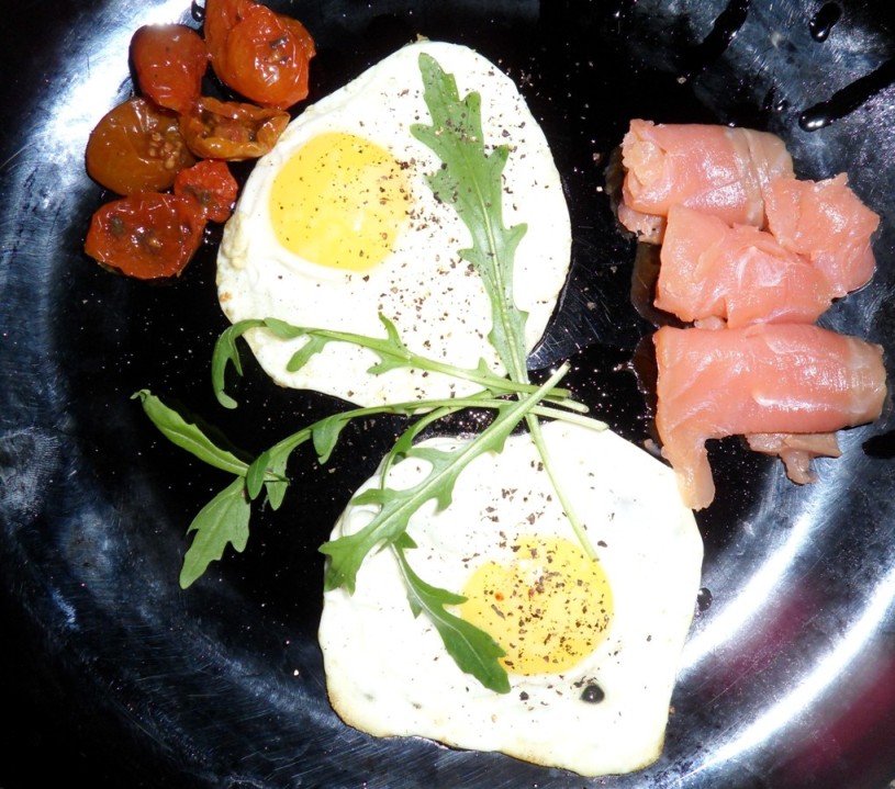 Яйца, руккола, семга, томаты вяленые в оливковом масле, соль, перец