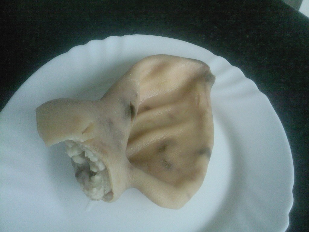 Собственно говоря, на приготовление этого, без натяжек скажу – деликатеса, сподвиг поход к Лизе (отчет уже накрапал). Дело в том, что мясной магазин какого-то хорошего завода (не помню названия), находится практически около ее подъезда. А после удачного КС, не зайти туда не смог. Из всего великолепия представленной там охлаждёнки, мой выбор пал на свиные уши по цене 75 руб. за кило. Взял два уха на 37 рублей. Причем, пакет не покупал, а так и вёз их в метро в руках до дома в прозрачном целлофановом кулёчке практически через всю столицу. Есно, народ давался диву. Но, вроде как на человеческие похожи только издалека, поэтому доехал без приключений.
