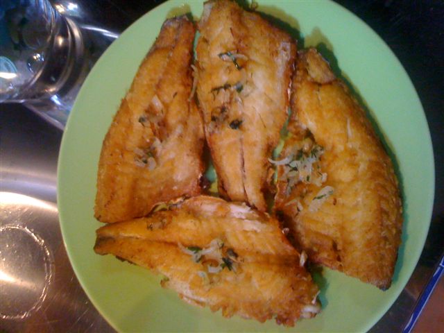 Взял филе сибаса на коже и просто на сковородочку на оливковом масле..... А в конце зеленью присыпал.....