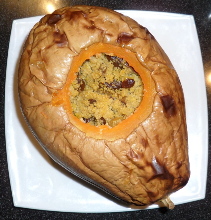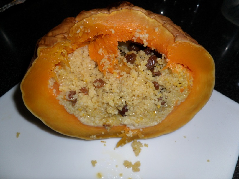 Итак, тыква тщательно обмывается снаружи. В ней вырезается круглое отверстие, через которое из тыквы вынимают семечки и волокна, в которые они вплетены. Промытые финики, курага и изюм смешиваются с кус-кусом и этой смесью заполняют очищенную серцевину тыквы. Нужно добавить сахара по вкусу, сливочного масла и молока. Все это можно просто поместить внутрь тыквы поверх смеси. Вырезанной крышечкой отвестие закрывают, и тыква помещается в духовку при 200 град.С на 40-60 минут. Время пребывания в духовке зависит от размера тыквы.