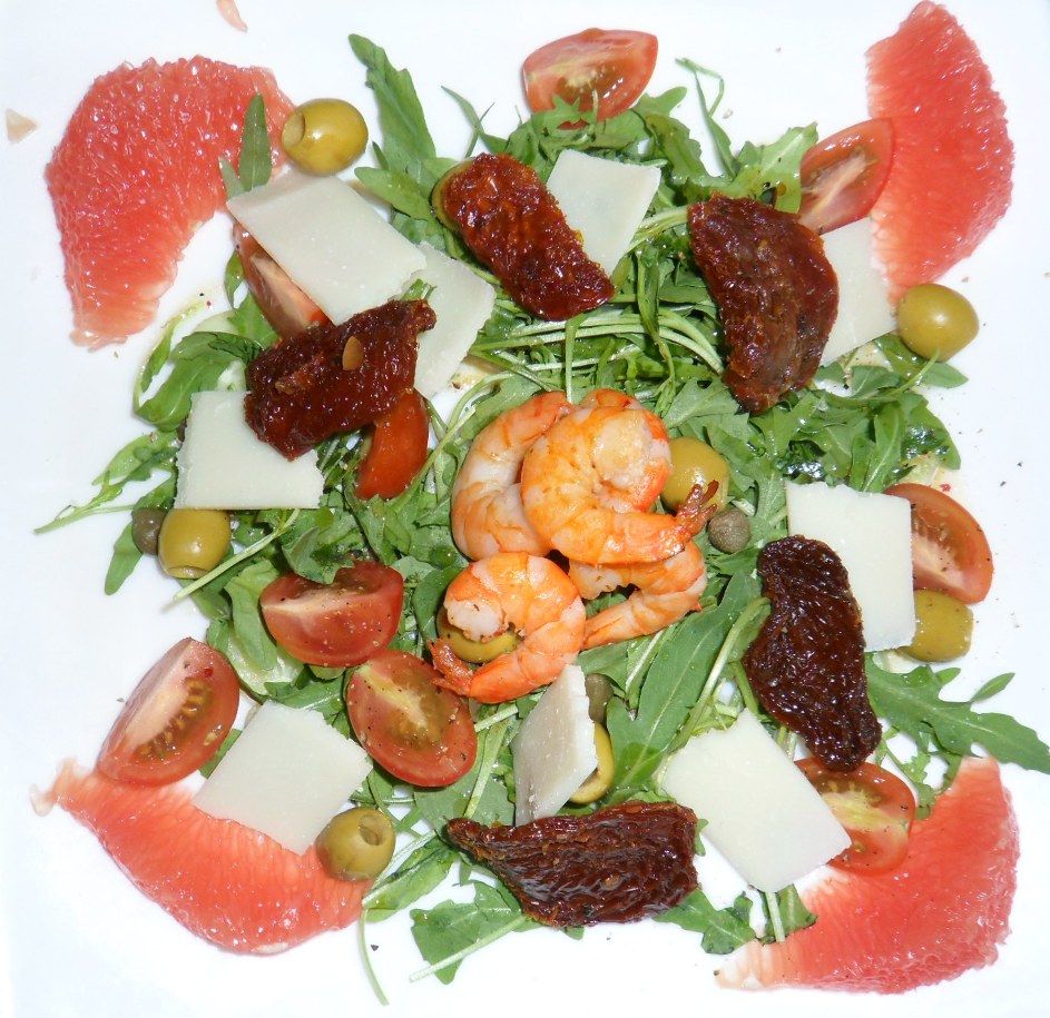 Руккола, очищенные креветки, помидоры-черри, каперсы, оливки, пармезан, вяленые томаты, дольки грейпфрута. Внизу - слой из долек свежего огурца, но их под рукколой не видно. Заправка - оливковое масло, бальзамический уксус, лимонный сок, соль, перец.