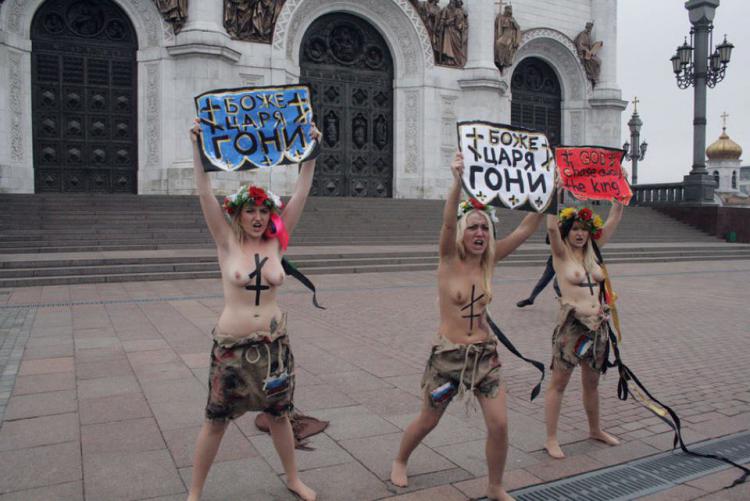 Активистки движения Femen провели в пятницу стремительную акцию у храма Христа Спасителя в центре Москвы. Девушки традиционно скинули одежды до состояния топлесс и развернули плакаты с лозунгом «Боже, царя гони!».