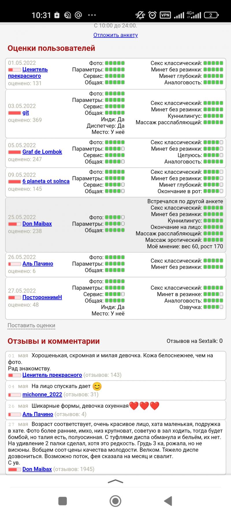 Вот был на днях, фото заманчивые, оценки норм. Меня месяц не брали, взяли со 2 й сим лишь. Вот я куею, как коллеги ставят оценки в ИС, и Ники старые. Нет доверяя. Фея норм, молодая, но низ крупные. Остался из за цены и лицо понравилось но на разок: