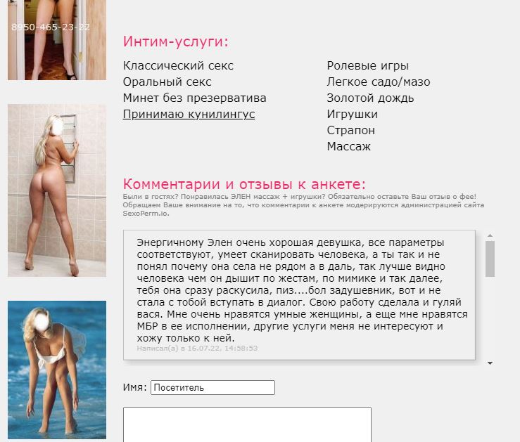 Женщина очень очень крупная, на очень большого любителя. Добрая как и все большие взрослые женщины но при ценнике 3000 тр . удивлён, что есть клиенты ( видимо Челябинские мужики не самые суровые ). Да и вообще ценник в Перми реально накручен у большинства фей и массажек в особенности ! Был давно просила 1.5 или 2 тр точно не помню, но не зашло от слова совсем. Так что рекомендация проста если любите огромную высоту, ширину, глубину, диаметр, массу, добрый пассив и при этом не нашли ничего за 1.5 тр (что удивительно) то вэлком ! Всем здоровья Гость .