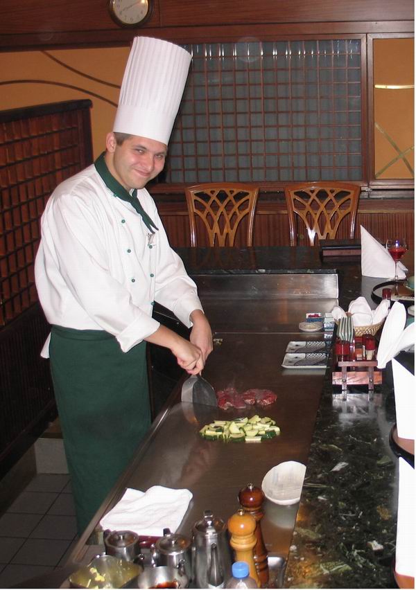 Ну да ладно - садимся. перед нами - пара меню и винная карта. меню с фотографиями, девочка по ходу все объясняет и отвечает на вопросы. Цены меня совсем не разочаровали - минимальная стоимость второго блюда - где-то 1300 руб. Потолок - это уже как фантазией распорядиться. К примеру 200 грамм мраморного мяса без гарнира стоит 5000р. Мраморное мясо для тех кто не знает - это мясо молоденьких бычков, которых выращивают на определенном острове в Японии, ежедневно делают массаж, отпаивают дорогим пивом и закалывают под классическую музыку. (чудаки все же эти косые). Наш с кисой выбор пал на: -пару салатов с натур камчатским крабом -свежие устрицы на льду (см фото с трансом в аттаче) -темпури яки (готовят при тебе) - жаркое из ягнятины -темпури яки - говяжья вырезка средней прожаренности -кабачки цуккини жареные -картофель фри -сливовое вино (из красн слив) -пару свежевыж соков -пару кружек пива Асахи -овощной салат (типа ассорти) это из того что запомнил. Начали с холодных закусок. Салат из краба - ваше всяких похвал. Устрицы - одни из лучших , которые мне доводилось есть. Вообще я не люблю этот деликатес, отдает сыростью морской, а вот подруга уплетала с огромным энтузиазмом и потом взяла с меня обещание регулярно ее подкармливать этими дарами моря. Пока доедали салатики, нам представили повара, и он с перманентной улыбкой на лице стал колдовать над горячими блюдами. На вопрос "как прожарить?" ответили - средне. Процесс выглядит весьма интересно - такое вечатление что руки повара существуют отдельно от него самого - так быстро на автомате он шинковал зелень для соуса, смешивал растительное и сливочное масло, резал мясо на кусочки. несомненно -это прибавило нам аппетита. Улыбка у повара входила в стоимость блюд, я так понял. Текучки кадров в этом ресторане скорее всего не наблюдается:) Буквально 10 минут и перед нами ароматные, дымящиеся мясные блюда. Вкус - да, это оно!! определенно можно оргазмировать! уж не знаю какое там на вкус мраморное мясо (как-нибудь попробую), счел в этот раз нерациональным выбрасывать сто баксов за 100 грамм говядины. Но то что нам приготовили эти кудесники однозначно заслуживало самой высокой оценки! И пусть интерьер староват и напрашивается уже некосметический ремонт помещения, еда там - отменная. В памяти всплыла сцена из первой матрицы - когда чел-предатель договаривался с агентом в ресторане и оооочень аппетитно ел бифштекс с кровью. Пиво - 300 р за поллитра. Асахи - хорошее разливное пиво. Не хуже и не лучше немецкого пива за 150 в Старине Мюллере к примеру. Скушали мясо, я крякнул от удовольствия и предложил подруге попробовать десерт, на что она ответила, что больше уже ничего не в состоянии даже попробовать. Я был тоже под завязку сыт. Расплатились, были одеты гардеробщиком и отчалили в хорошем расположении духа смотреть кино. Счет на двоих - 8500р плюс 500р на чай официантке. Резюме - ресторан Токио не разочаровал, но интерьер смотрится уже черезчур простенько. Местами на стенах я заметил даже явные царапины. Нехорошо для заведения подобного уровня. Помню когда сдавали ресторан Три пескаря где0то год назад и я имел удовольствие видеть его во всей красе, я сильно поразился - как в одном из самых дорогих и раскрученных мест в Москве мог быть настолько посредственный по сути интерьер. Тут было схожее чувство. Но еда - супер!