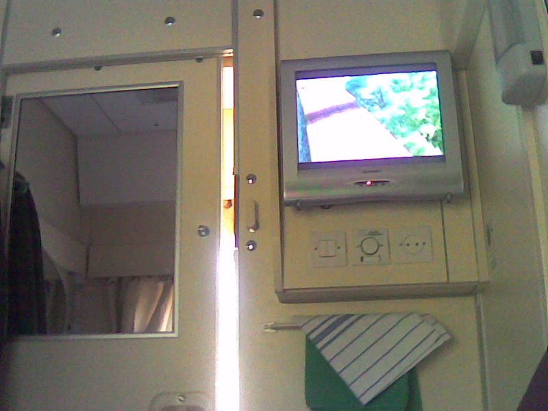 Туда я ехал в обычном четырехместном купе (ну нижние полки были несколько другими), с двумя верхними полками поднятыми и переклееными бумажками номерами мест, в стоимость включалась только хамоватая проводница, которую пришлось ставить на место начальником поезда, ни белье, на завтрак, ни напитки - так щедро разрекламированные в справочном вокзала - не были предусмотрены, даже вагона-ресторана не было прицеплено. Один из туалетов был био и был всегда закрыт, всё до того же разговора с начальником поезда.